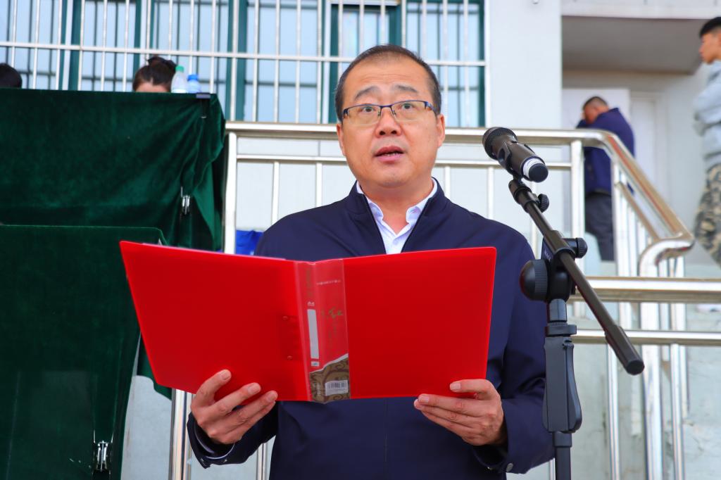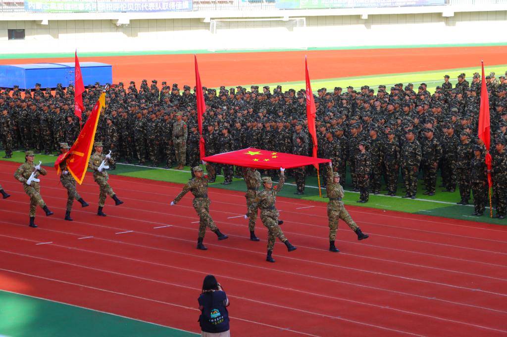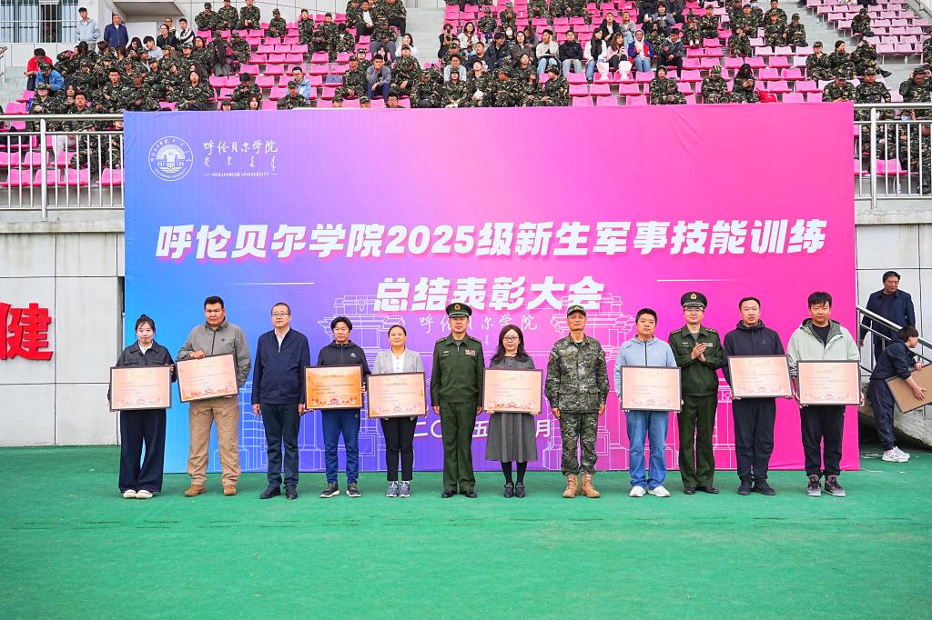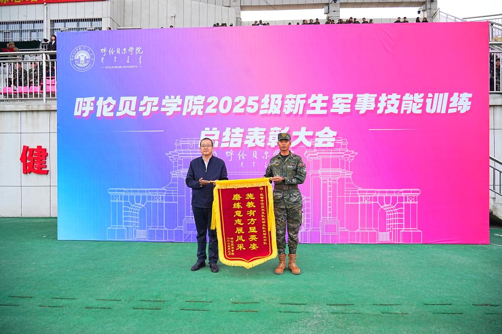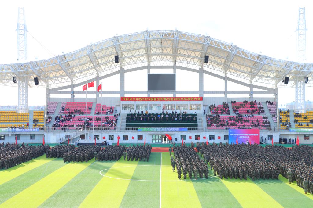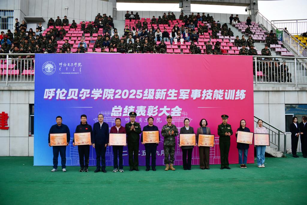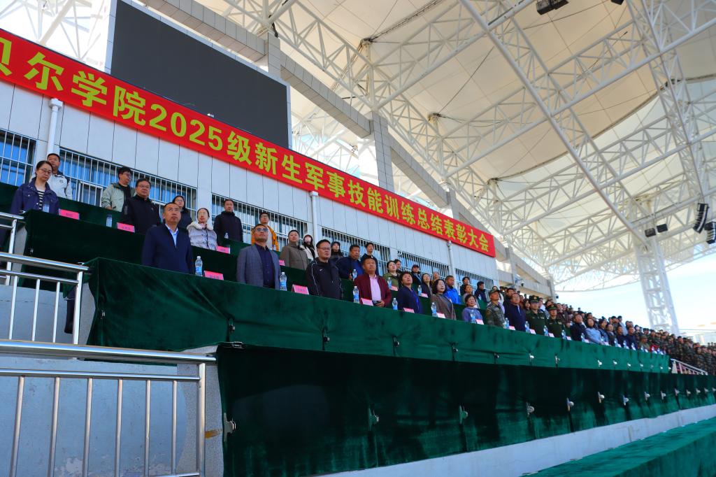 9月15日下午,我校在东山体育场举行2025级新生军事技能训练总结表彰大会。校党委副书记张宏天、呼伦贝尔军分区战备建设处副处长白钢、武警呼伦贝尔支队副支队长蔡永刚、海拉尔区人民武装部部长丁玉龙、各二级学院党委书记、党委副书记、团学办主任、2025级新生辅导员参加大会,大会由学生工作处(党委学生工作部、武装部)处(部)长郝新君主持。