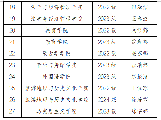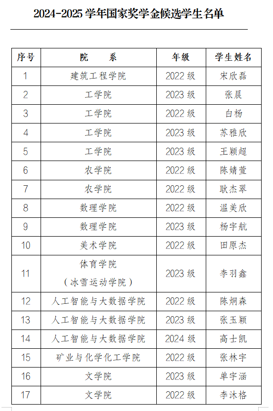 呼伦贝尔学院2024-2025学年国家奖学金评选工作于9月23日开始至10月16日结束,经各学院推荐、学生工作处(党委学生工作部、武装部)审核,拟推荐宋欣磊等27名同学为本次国家奖学金候选人,现予以公示。