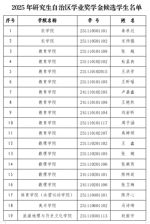 呼伦贝尔学院2025年研究生自治区学业奖学金评选工作于9月24日开始至10月20日结束,经各学院审核推荐,学生工作处汇总相关材料,拟推荐秦承达等26名同学为本次研究生自治区学业奖学金候选人,现予以公示。